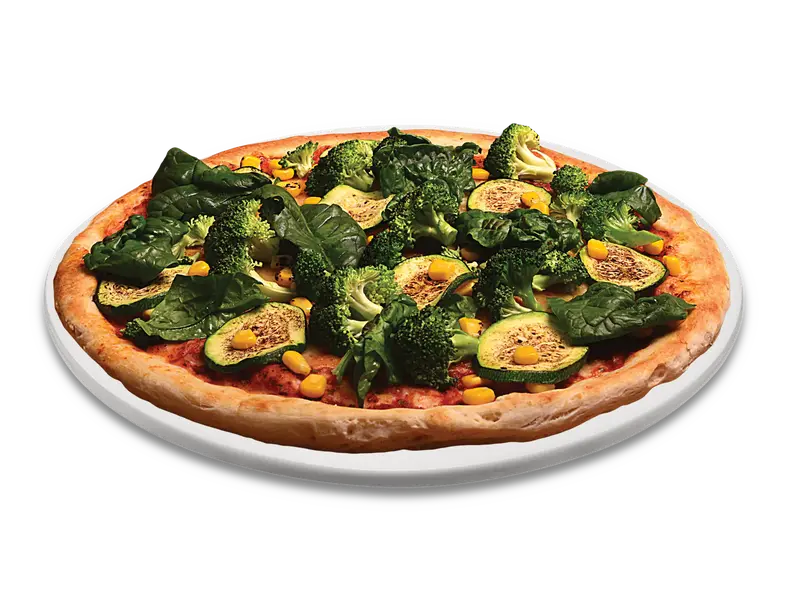 Frischer Teig, Tomatensauce, veganer Pizzaschmelz, Zucchini, Broccoli, Spinat, Mais